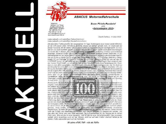 Jeweils bei den ersten Kursen im Frühling nehme ich letzjährige Fahrschüler, die den Fahrzeugbeherrschungskurs repetieren möchten, soweit es Platz hat zum halben Preis: Dies gibt die Möglichkeit, einen guten Start in die neue Fahrsaison zu machen und oft haben meine Fahrschüler inzwischen ihre eigene Maschine, nachdem sie den Kurs auf der Fahrschulmaschine gemacht haben. |