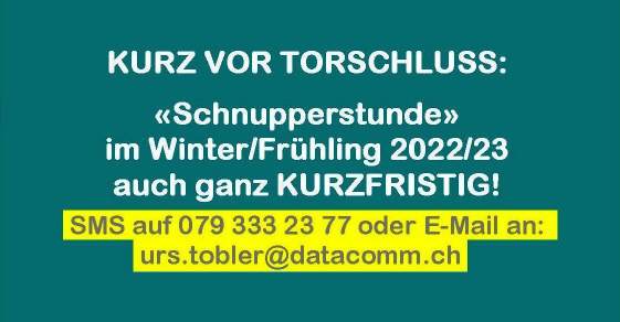 Du brauchst für die Repetition keine Theorie zu besuchen, auch muss die Reihenfolge nicht zwingend eingehalten werden: Wer noch etwas Mühe hat, sollte aber nach Möglichkeit erst den 1.Kursteil und später den 2.Kursteil besuchen – kann dies aber auch auf mehrere Kurse verteilen, wir sind da sehr flexibel. Wer nicht leer ausgehen will, reserviert noch heute! Entsprechende Mails an urs.tobler (at) datacomm.ch oder per Tel. 044 313 13 33 an Milly: Sie führt ebenfalls eine Kursliste. |