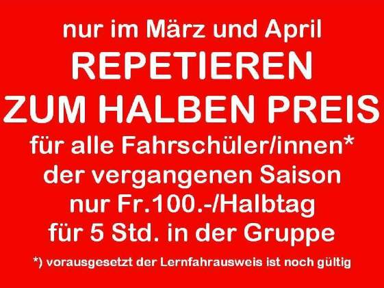 Unter der Voraussetzung, dass anschliessend mit Doppellektionen die Prüfung vorbereitet wird, darf man das zum halben Preis tun, innerhalb des Kursprogramms bis Ende April. |