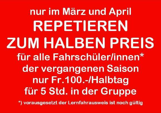 Für alle Kursteilnehmer/innen der abgelaufenen Saison, die ihre praktische Führerprüfung noch nicht hinter sich gebracht haben, biete ich im März und April den Fahrzeugbeherrschungskurs zum halben Preis (200.-) zu repetieren, um anschliessend die Fahrstunden zu besuchen. Das Angebot gilt auch für Kunden, die ihre Ausbildung im Einzelunterricht abschliessen möchten, obwohl sie die Prüfung bereits absolviert haben! |