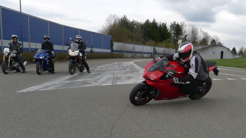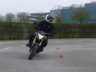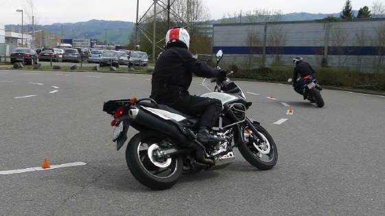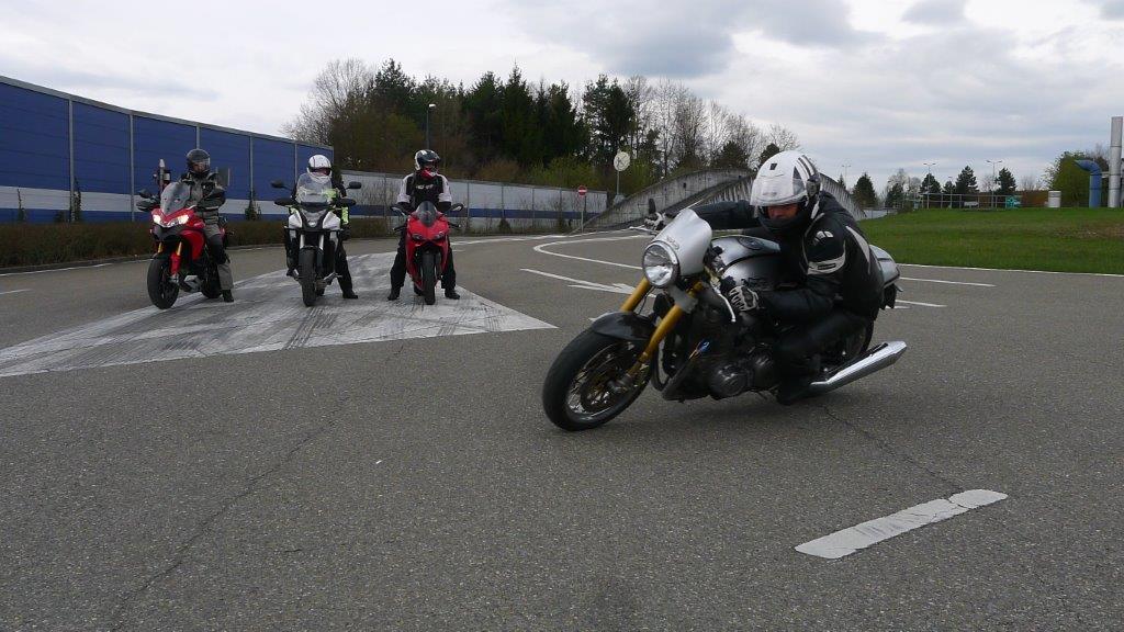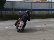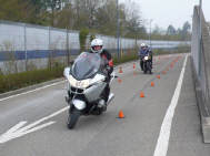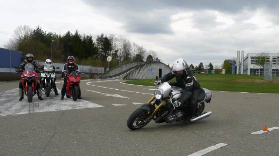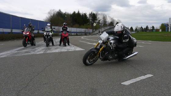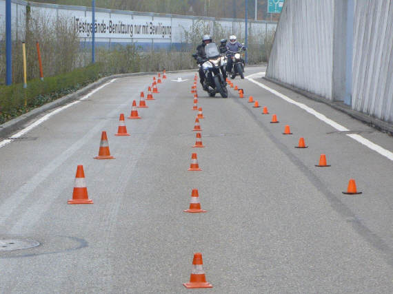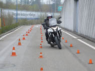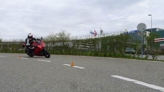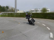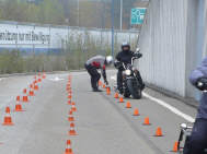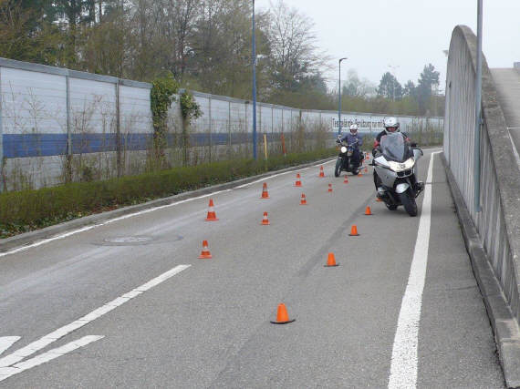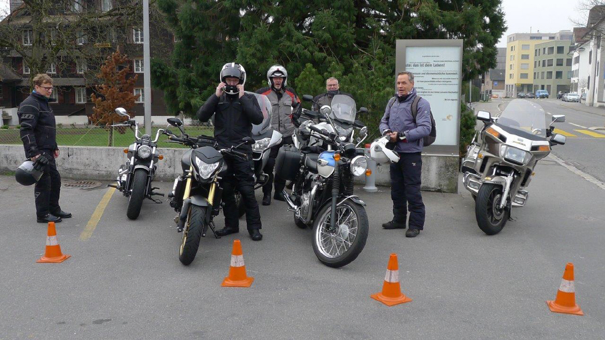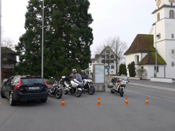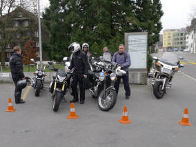 Beim Einfahren (es bizzli Kürvli fahren) zum Auflockern und Reifen anwärmen, konnten wir die Bodenbeschaffenheit etwas studieren. Im Laufe der Zeit hatte der Belag gelitten und offenbar waren auch Winterschäden noch nicht behoben. Daneben gab es stark Salz-verschmutzte Flecken, genau auf der Fahrspur, die wir normalerweise für das Schräglagentraining nützen. Dies machte zusammen mit den Bodentemperaturen knapp über dem Gefrierpunkt nicht wirklich Mut für «verschärfte Schräglagen» in der Kreisfahrt. So beschlossen wir, nach dem Einfahren erst mal ein bisschen stabilisierende Langsamfahrübungen zu machen. |