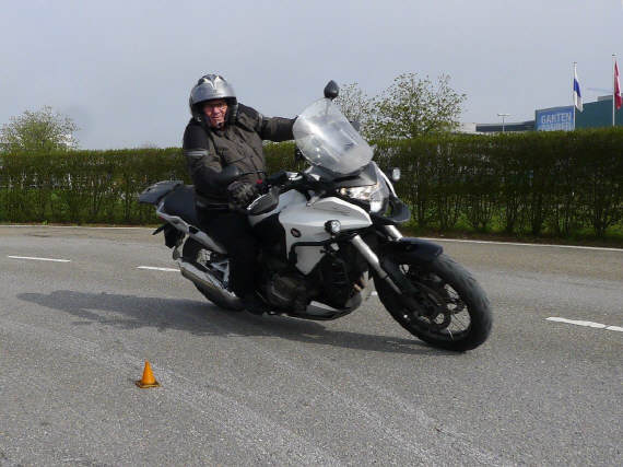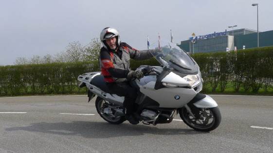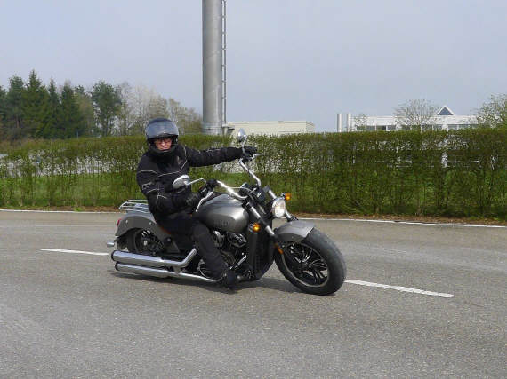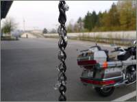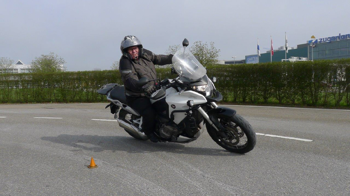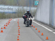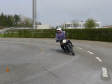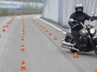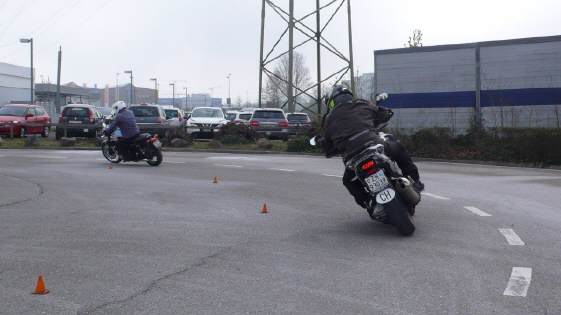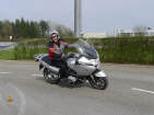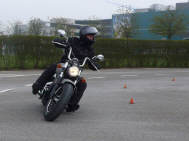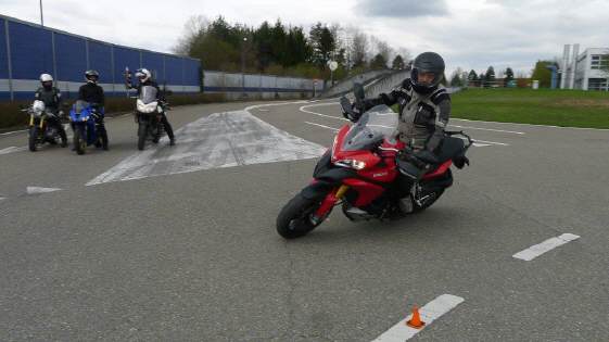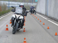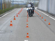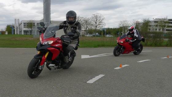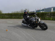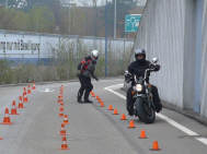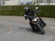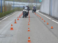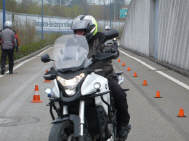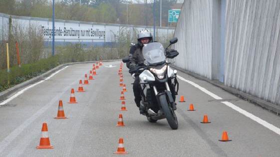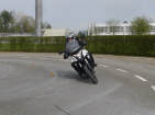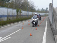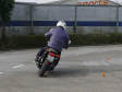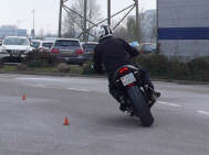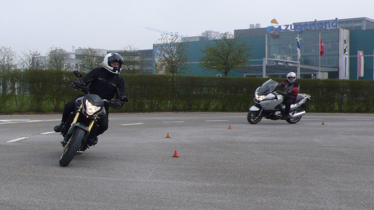 Beim Einfahren (es bizzli Kürvli fahren) zum Auflockern und Reifen anwärmen, konnten wir die Bodenbeschaffenheit etwas studieren. Im Laufe der Zeit hatte der Belag gelitten und offenbar waren auch Winterschäden noch nicht behoben. Daneben gab es stark Salz-verschmutzte Flecken, genau auf der Fahrspur, die wir normalerweise für das Schräglagentraining nützen. Dies machte zusammen mit den Bodentemperaturen knapp über dem Gefrierpunkt nicht wirklich Mut für «verschärfte Schräglagen» in der Kreisfahrt. So beschlossen wir, nach dem Einfahren erst mal ein bisschen stabilisierende Langsamfahrübungen zu machen. |