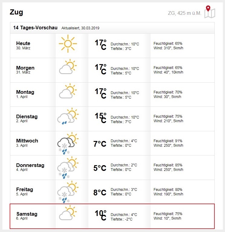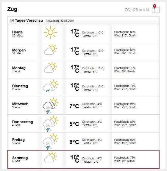 Quelle: Wetter.ch, Stand vom 30.3.2019