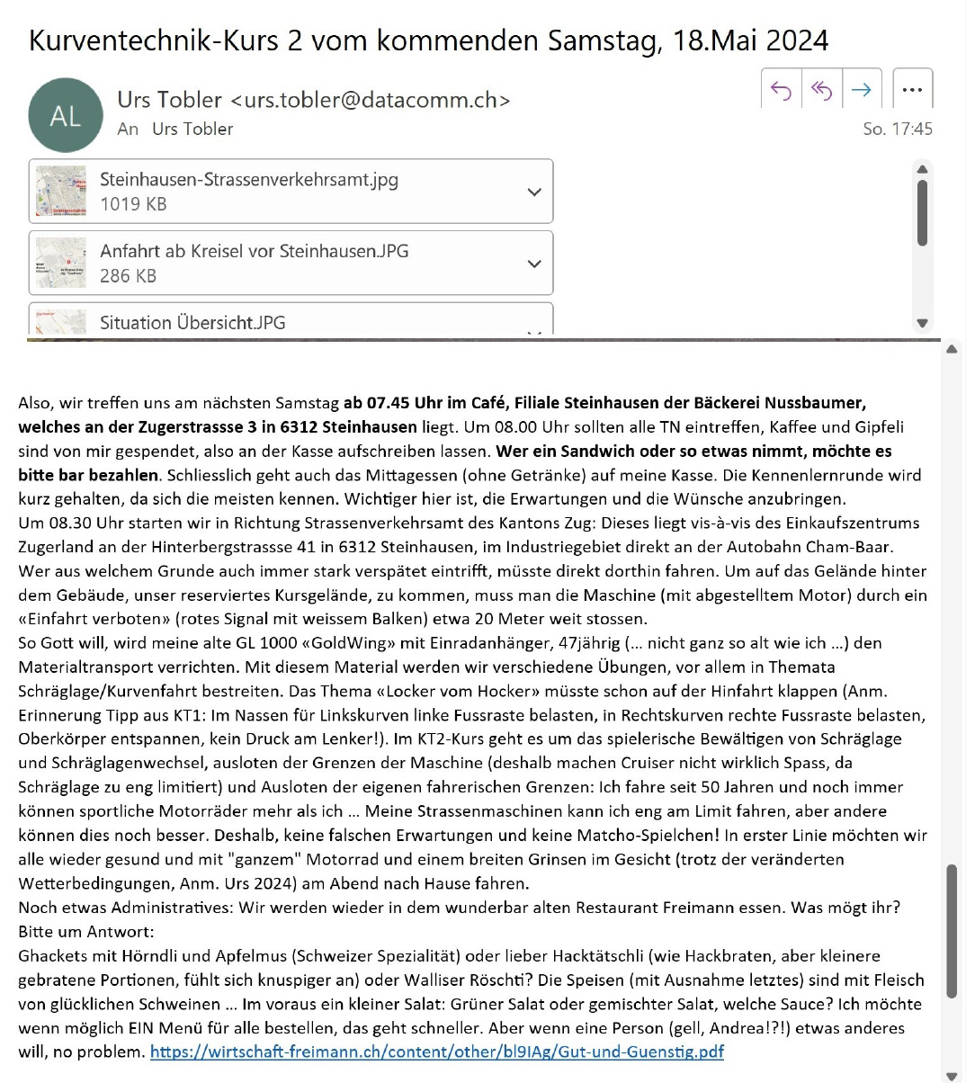 Wenn es mehr als 6 TN sind, ist im Preis von Fr. 220.- das Mittagessen inbegriffen. Treffpunkt ist das Café Nussbaumer an der Zugerstrasse 3 in Steinhausen. Der Kurs selbst findet auf dem Gelände des Strassenverkehrsamts in Zug statt. Hier geht's zu den Bildern vom letzten Kurs im letzten Jahr. Link zur Teilnehmerliste