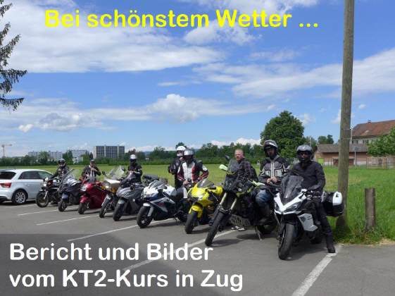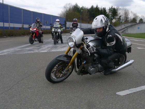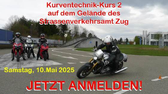 Seit vielen Jahren findet der Kurventechnik-Kurs 2 auf dem Gelände des Strassenverkehrsamtes in Zug statt. Der Termin für diesen Kurs fällt auf den 6.April, wir hoffen auf angenehmes Frühlingswetter. Der Kurventechnik-Kurs steht all jenen offen, die bei uns den Kurventechnik-Kurs 1 absolviert haben. Es geht hier, nachdem man im Kurs 1 eine saubere, sichere Kurvenlinie gelernt hat, sich Reserven für Notfälle anzueignen: Verschärfte Schräglage im Kreis, im schnellen Slalom und Ausweichen sind Themen des KT2. Je nach Gruppe widmen wir uns auch dem Bremsen aus höheren Geschwindigkeiten. Hierfür braucht es recht viel Zeit, die nicht immer zur Verfügung steht. Mein Motto lautet: «Lieber weniger, aber das dafür richtig!» In der Schlussphase bewegen wir uns noch im Realverkehr, um das Gelernte in der Wirklichkeit umzusetzen! Die Umgebung von Zug eignet sich dafür hervorragend. |
