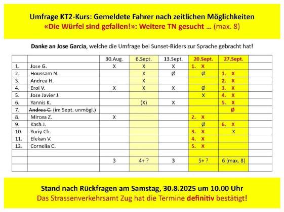 Noch 3 Plätze frei am 20.Sept., noch 2 am 27.Sept. |