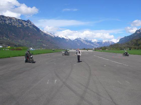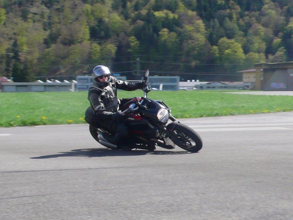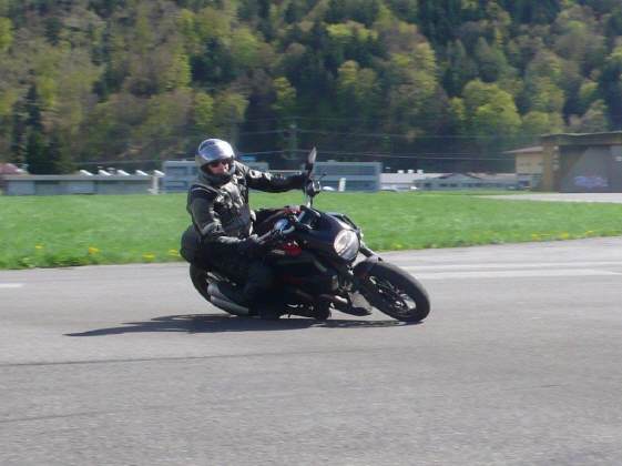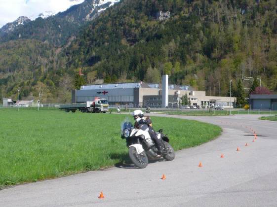 Dieses Bild entstand kurz nach 16 Uhr: In der Schlussübung mussten die Teilnehmer in der Schräglage auf Befehl des Instruktors anhalten - das klappte ja eigentlich gut, nur in der Rechtskurve will die Maschine abgefangen werden vor dem Stillstand! Denn mit eingeschlagenem Rad kippt sie naturgemäss ein ... w.z.b.w oder in Lateinisch: q.e.d.