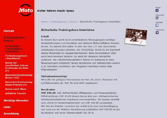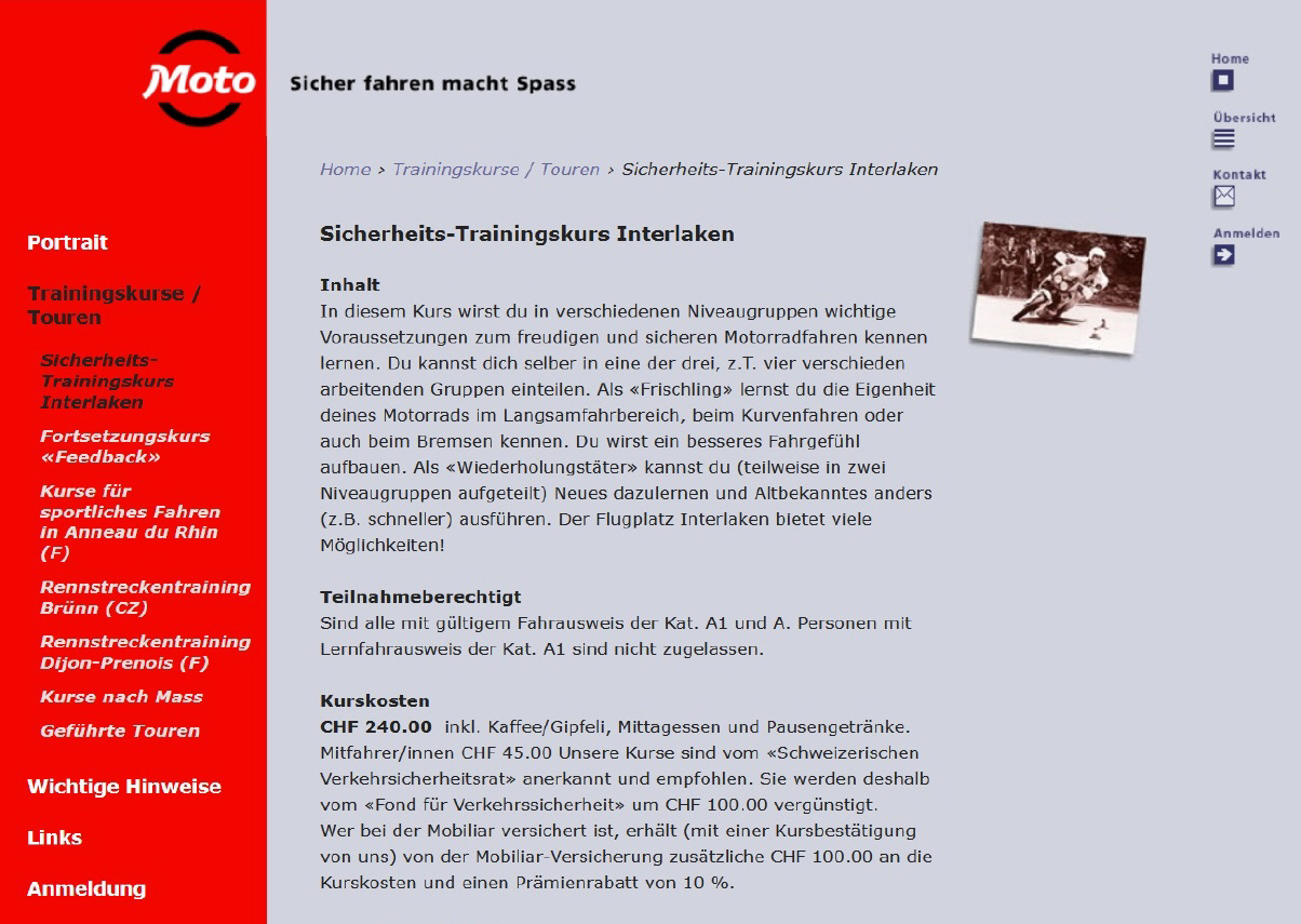 Dieser Weiterbildungskurs wird vom Veranstalter «moto-trainingskurse.ch» durchgeführt, der Kurs ist empfohlen vom Verkehrssicherheitsrat und ist rückerstattungsberechtigt. Deshalb ist er sehr preisgünstig: Im Preis von Fr. 240.- ist die Organisation der Hin- und Rückfahrt, die ganztägige Betreuung in der Gruppe von max. 8 Kursteilnehmern, Znüni- und Zivieri-Kaffee wie auch das Mittagessen inbegriffen. Versicherung ist Sache des Teilnehmers, Vollkasko-Versicherungen sind in einem Weiterbildungskurs gültig. Für das Abendessen und Hotel müssen Kosten von etwa Fr. 100.- (im DZ) eingeplant werden. Die Anfahrt am Vorabend kann auf eigene Faust geschehen oder innerhalb verschiedener Gruppen gewählt werden, entsprechende Angaben bekommst Du kurz vor dem Kurs. Die Bezahlung des Kurses aller Teilnehmer der Tramstrasse geschieht über Urs Tobler, Du kannst die Angaben zu meiner Bank unter «Kontakt» finden oder einen Einzahlungsschein als PDF [97 KB]