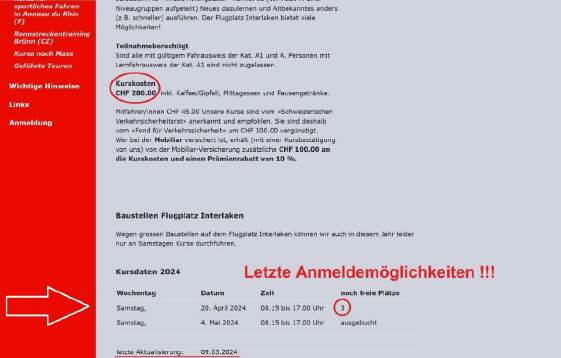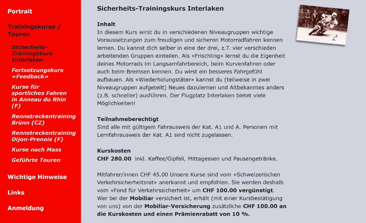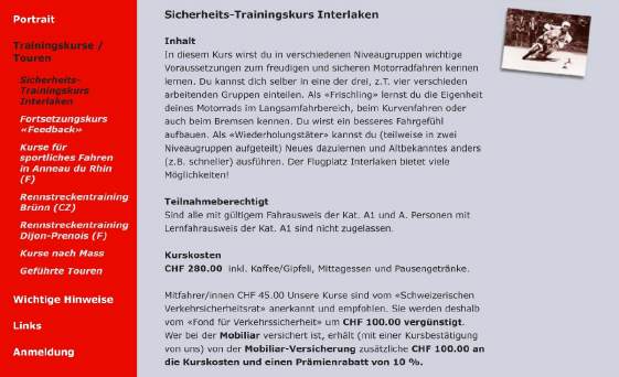 Dieser Weiterbildungskurs wird vom Veranstalter «moto-trainingskurse.ch» durchgeführt, der Kurs ist empfohlen vom Verkehrssicherheitsrat und ist rückerstattungsberechtigt. Deshalb ist er sehr preisgünstig: Im Preis von Fr. 280.- ist die Organisation der Hin- und Rückfahrt, die ganztägige Betreuung in der Gruppe von max. 8 Kursteilnehmern, Znüni- und Zivieri-Kaffee wie auch das Mittagessen inbegriffen. Versicherung ist Sache des Teilnehmers, Vollkasko-Versicherungen sind in einem Weiterbildungskurs gültig. Für das Abendessen und Hotel müssen Kosten von etwas mehr als Fr. 100.- (im Einzel oder Doppel-Zimmer) eingeplant werden. Die Anfahrt am Vorabend kann auf eigene Faust geschehen oder innerhalb verschiedener Gruppen* gewählt werden, entsprechende Angaben bekommst Du kurz vor dem Kurs. * Da am Sonntag, 7.Mai der LOVERIDE in Dübendorf stattfindet und ich am Samstag meinen Stand aufstellen muss, kann ich nur die Gruppe, die sich für den zweiten Samstag, für den 13.Mai anmeldet, selbst betreuen.