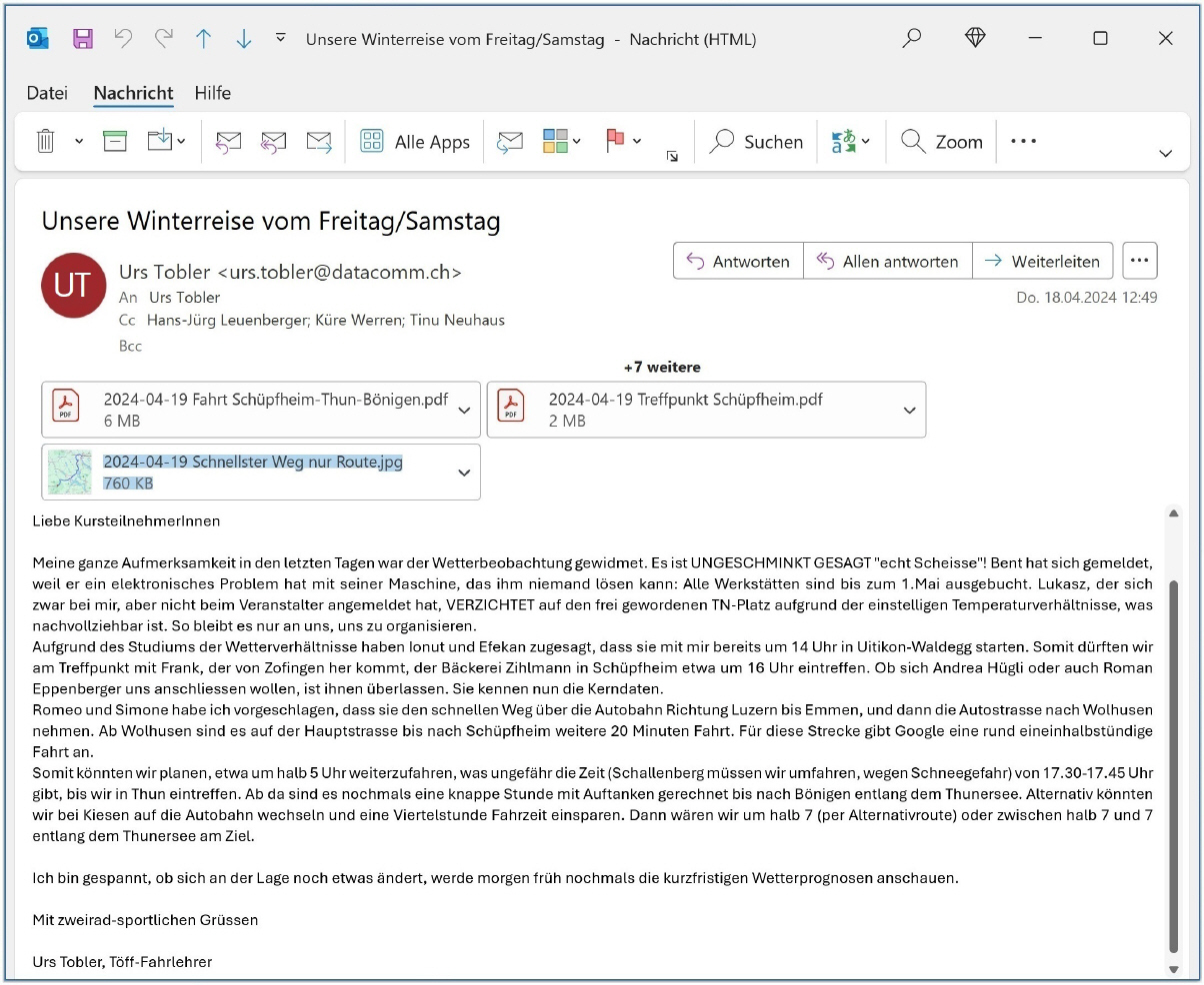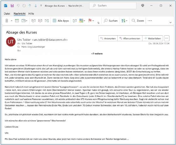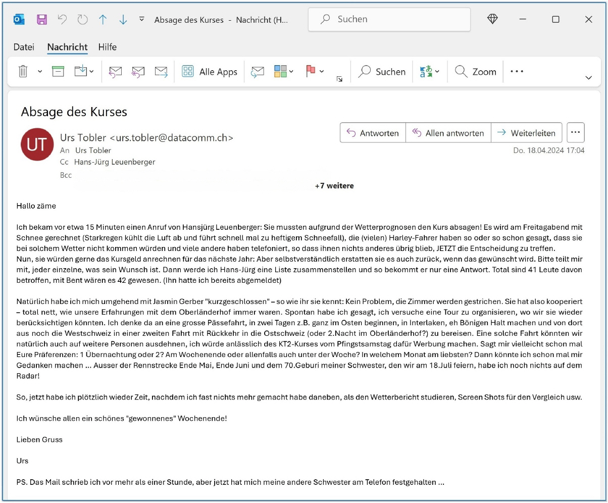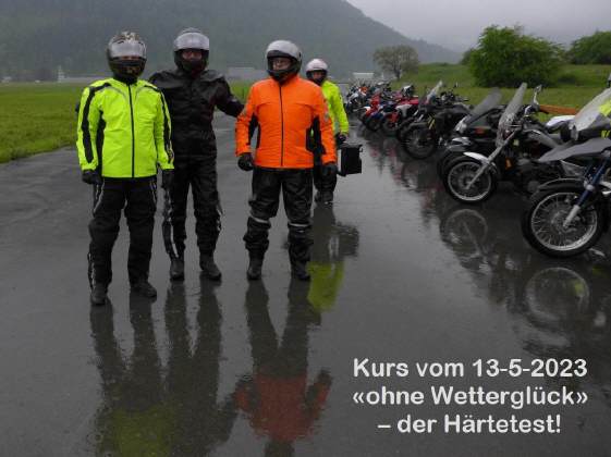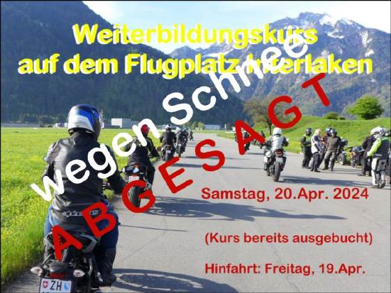 Am Donnerstag, 16.April traf um 15.18 Uhr die telefonische Absage des Kurses ein, die ich gleich per WhatsApp und dann per Mail an meine Teilnehmer durchgab. Die Wetterverhältnisse waren wirklich miserabel vorausgesagt, in der Nacht zum Samstag musste man damit rechnen, dass es in Interlaken schneien würde. Die SchönwetterfahrerInnen (wohl vorwiegend auf Harley-Maschinen unterwegs) hatten sich bei Hans-Jürg schon frühzeitig gemeldet, dass unter diesen Voraussetzungen (nass mit Temperaturen im einstelligen Bereich) nicht mit ihnen zu rechnen ist. |