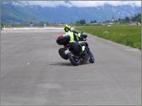 Als wir heraustraten, war es noch kein bisschen besser: Der Regen dürfte uns den ganzen Morgen begleiten, dachten wohl alle. Wegen des Regens gibt es kaum Fotos vom Morgenprogramm, da ich praktisch beim ganzen Programm mitgefahren bin. Neben einer nassen Linse gibt's auch keine spektakulären Bilder von Schräglage - was sollen dann stehende Bilder ausdrücken? So machten wir verschiedene Fahrübungen, aber halt wenig spektakulär, da sich ja niemand auf die Schnauze legen wollte. Erst nach der Znünipause liess der Regen nach und die Sonne drückte etwas aus dem grauen Deckel. |