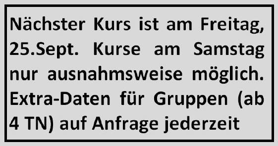 Der nächste Kurs findet dann wieder zum letzten Freitag im September, am FR, 25. Sept. 2020 statt! |