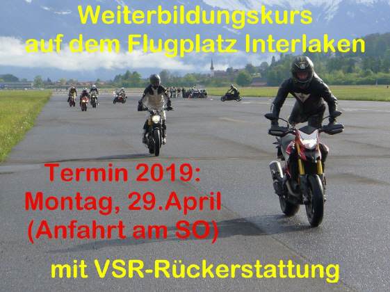 Dieser Kurs ist unser jüngster Kurs: Nachdem ich, zusammen mit meinem Instruktor Oliver, dort einen Fahrlehrer-Weiterbildungskurs absolviert hatte war ich so begeistert, dass ich beim Veranstalter mototranings-kurse.ch anklopfte, ob es nicht möglich wäre, in Untermiete bei ihnen das Angebot für meine Kunden zu machen. Dieser Weiterbildungskurs hat sich zu einem Renner entpuppt und unser frisch-gebackener VSR-geprüfter Instruktor Roli Schneider ist jeweils verantwortlich, deshalb gibt es bei diesem Kurs eine Rückerstattung. Seit einem Jahr ist der Betrag von Fr. 200.- auf 100.- geschrumpft, und deshalb bezahlt jeder Teilnehmer Fr. 240.-, (bei max. 8 TN/Instr.) alle Pausengetränke und auch ein feudales Mittagessen ist im Preis eingeschlossen. Da Interlaken nicht gleich um die Ecke liegt, gibt es eine gemeinsame Anfahrt und Übernachtung (Zimmer/Nachtessen ca. 100.-) vor dem Kurs. Die Abfahrtszeit für Pensionierte und gemütliche (An-)FahrerInnen wird individuell vereinbart, meine Gruppe trifft sich um 17.00 Uhr bei der Passarelle in der Waldegg, von wo aus wir eine tolle Strecke zügig unter die Räder nehmen. Dieser Kurs ist nur für routinierte Töff-Fahrer/innen. |