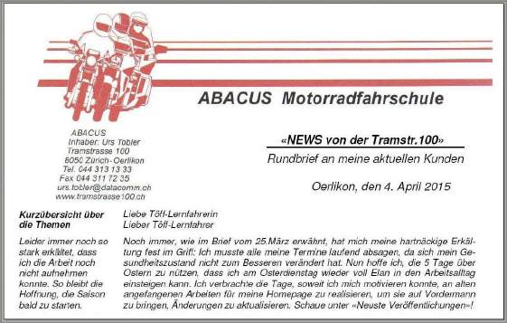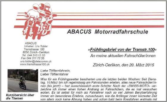 An dieser Stelle möchte ich nochmals explizit auf mein Frühlingsangebot aufmerksam machen: «Repetieren zum halben Preis!» Wer im letzten Jahr den Grundkurs besucht hat, dessen Lernfahrausweis in der Zwischenzeit noch nicht abgelaufen ist und sich auf eine bevorstehende Prüfung mit mir vorbereiten will, (mindestens zwei Doppellektionen im Einzelunterricht) darf den Grundkurs oder Teile davon zum halben Preis wiederholen. Damit kann man an das Können vom letzten Jahr anschliessen, alles geht beim zweiten Mal viel ringer und es stellt sich ein Wohlgefühl in der Beherrschung des Fahrzeugs ein, was vor allem für das Bestehen der Manöverprüfung, aber auch bei der Bewältigung heikler Fahraufgaben (Zürichberg!) weiterhilft. Das hilft dann auch im Einzelunterricht und in der Prüfungssituation das nötige Vertrauen in sich selbst, aber auch zur Maschine, aufzubauen, das es für den Erfolg braucht. |