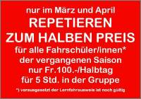 Für alle Kursteilnehmer/innen der abgelaufenen Saison, die ihre praktische Führerprüfung noch nicht hinter sich gebracht haben, biete ich im März und April den Fahrzeugbeherrschungskurs zum halben Preis (200.-) zu repetieren, um anschliessend die Fahrstunden zu besuchen. Das Angebot gilt auch für Kunden, die ihre Ausbildung im Einzelunterricht abschliessen möchten, obwohl sie die Prüfung bereits absolviert haben! |