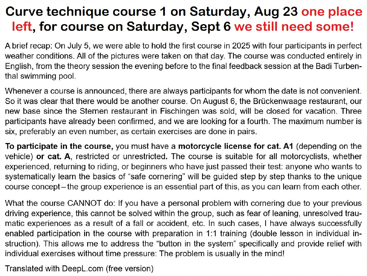 In diesem Jahr gab es noch keinen einzigen Kurventechnik-Kurs 1, da ich noch keine Kunden hatte, die bereit dafür waren. Leider kam der für Freitag, 29.Juli, bzw. Samstag, 30.Juli ursprünglich vorgesehene Kurs auch nicht zustande, so dass ich nun ausnahmsweise einen Kurs am Sonntag, 21.August durchführen werde.