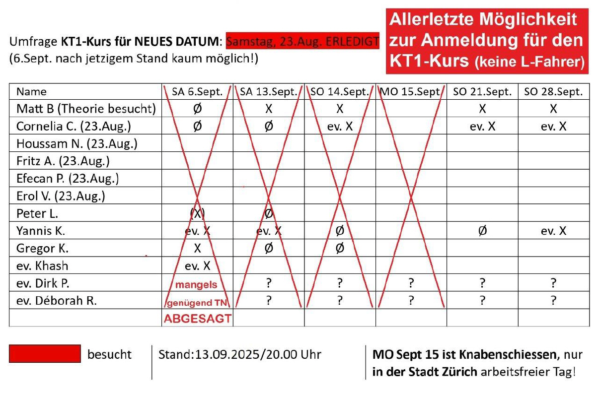 Zusatz-Kurs KT 1 definitiv am SA, 25.Sept. 2021 |