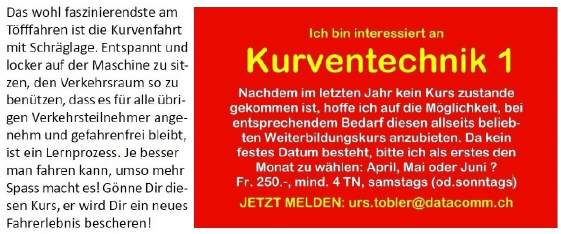 Falls Du Dich für den KT2-Kurs interessierst (Voraussetzung: KT1 besucht), sende mir ein Mail an urs.tobler (at) datacomm.ch. Ich brauche mind. 6 TN, da ich dazu das Strassenverkehrsamt Zug mieten muss.