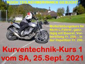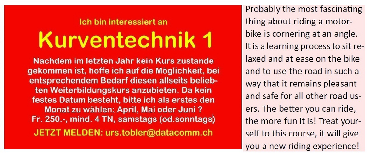 Der nächste Kurventechnik-Kurs 2018 wird am Samstag, 20.Okt. stattfinden. Die Theorie dazu findet wenn am Freitagabend, dem 19. Okt. von 18.15-20.30 Uhr statt. Link zur Teilnehmerliste.