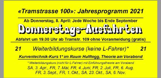 Ebenfalls führen wir ab April wieder regelmässig die Donnerstagsausfahrten durch, eine gute Möglichkeit (gratis) zu Übungsgelegenheiten zu kommen. Je nach Wetterverhältnissen gibt es neben dem Start um 19 Uhr an der Tramstrasse 109 weitere Startzeiten und Startorte. Mehr dazu findest Du auf meiner Webseite unter Veranstaltungen/Donnerstagsausfahrten. Wer sich in der entsprechenden Verteilerliste eintragen lässt, bekommt regelmässig spätestens am Mittwoch jeweils per Mail die entsprechenden Angaben zu Start und Ziel.