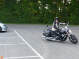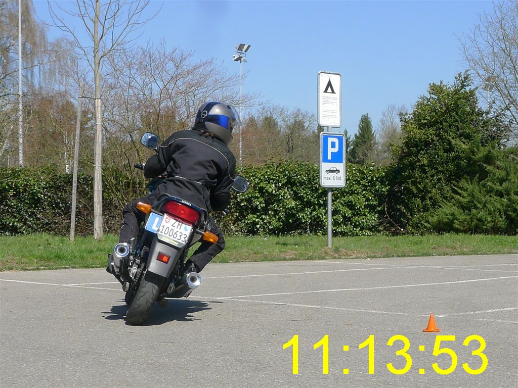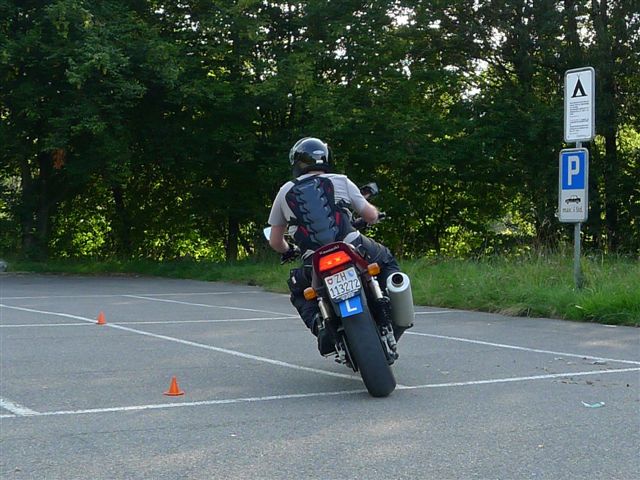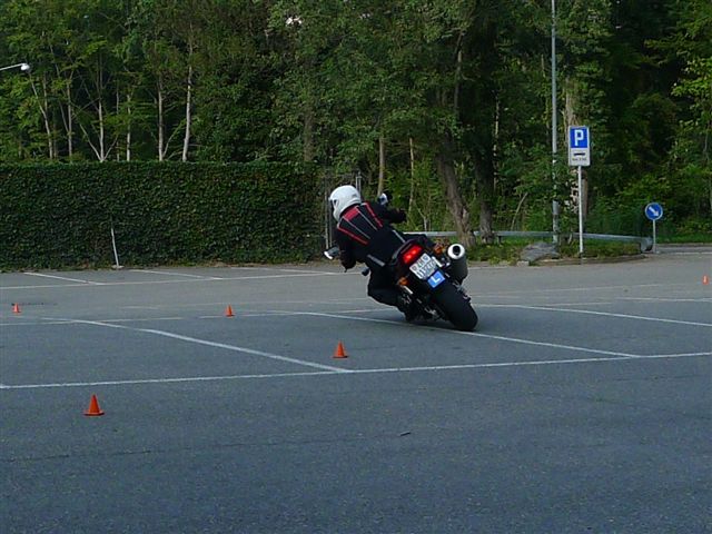 Eingangs der Kurve: Bilck zur Pylone, an der Pylone mit Blick und mit Töff bleiben, etwa in der Mitte Blick lösen und zum Ziel schauen! Dadurch kippt der Töff und mit Gas und Kupllung wird der Töff aus der Kurve herausgenommen. Blickt der Schüler anderswo hin, geht es nicht eng um die Kurve, blickt er auf den Boden: Augenblicklich wird der Fuss abgesetzt! Bild rechts: Detailansicht vom dritten Bild, Blick wandert weg von der Pylone - die Kurve wird weiter! |