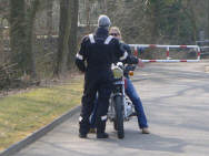 Sobald der Motor läuft, erste Start- und Landeübungen mit Motor absloviert sind, setze ich mich hinten drauf: So kann ich überwachen, Hilfestellung leisten verbal oder, falls nötig, direkt eingreifen - so, dass wirklich nichts passieren kann! So kommen auch nie Ängste auf vor dem Fahren zu zweit: Bei mir gehört das praktisch vom ersten Meter an dazu. (Diese Fotos wurden vom Freund der Fahrschülerin mit meiner Kamera geschossen während der anderthalb Stunden auf dem Parkplatz) |
