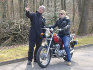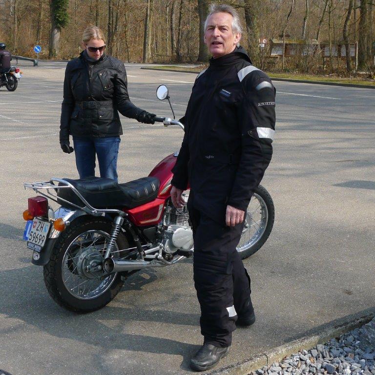 Arvis meldete sich per SMS am Montagabend und wir vereinbarten den ersten Termin am Dienstagnachmittag. Er war früher schon Scooter gefahren und brachte deshalb Erfahrung mit, aber nicht auf Fuss-geschalteten Motorrädern. An der Frohburgstrasse setzte er sich erstmals hinter den Lenker und erlebte frei rollend (ohne Motor) das gegenüber einem Motorroller völlig andere Handling. Da er seine Sache sehr gut gemacht hat, setzten wir die Langsamfahrübungen mit dem Motor gleich fort in der Ebene, mit Anfahrgas und Kupplungsschleifpunkt. In einer zweiten Runde kamen dann die «Start- und Landeübungen», anfahren und anhalten, bergab ohne Motor, bergauf mit Motor. Beim Berganfahren setzte ich mich auf den Soziussitz, damit die Anforderungen gesteigert werden konnten. Die Fahrstunde beendeten wir mit Langsam- und Slalom-Fahrübungen auf dem Parkplatz - mehr lag nicht drin, weil mein Kandidat ohne Lernfahrausweis auf öffentlichen Strassen nicht fahren durfte. |