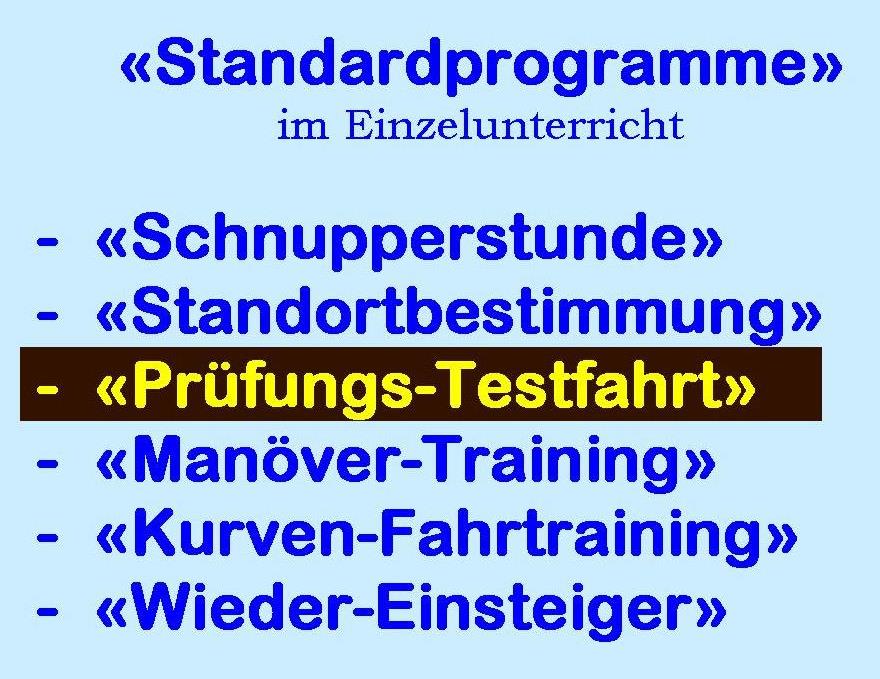 Bin ich schon bereit für die Prüfung? Diese Frage stellen sich viele, wenn der Prüfungstermin immer näher kommt ... Wenn sich bei mir ein Fahrschüler, eine Fahrschülerin meldet, ob eigene oder fremde, gibt es immer die gleiche Strecke: Da weiss ich, wo die meisten sich falsch verhalten und kann es in ein Verhältnis stellen. Es ist eine Strecke, keine wirklich schwierige - so halt wie an der Prüfung - aber es kommen auch 2, 3 Stellen vor, wo man dann wirklich den Unterschied sehen kann. In einem zweiten Teil dann machen wir alle Prüfungsmanöver auf einem öffentlichen Parkplatz, wo wir in der Regel in aller Ruhe einen Durchgang ohne Störungen machen können. |