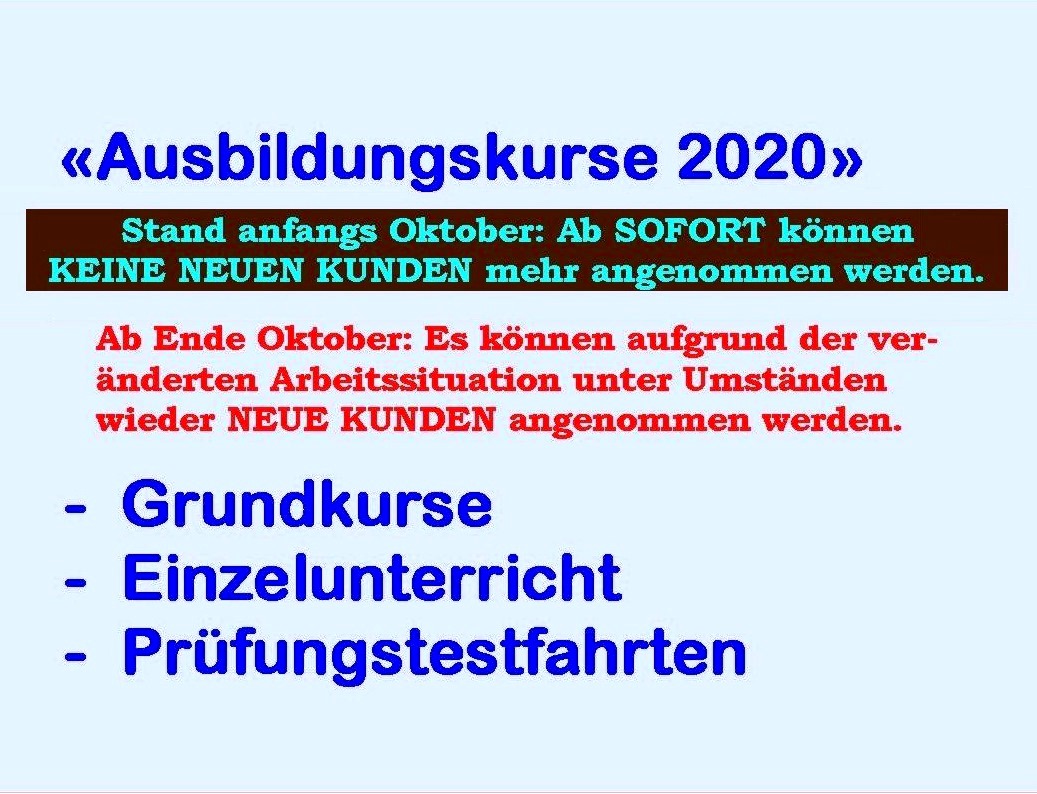 Damit entspannt sich auch die Lage in meiner Agenda. Es gibt wieder vereinzelt «Löcher», welche für neue Fahrschüler/innen zur Verfügung stehen. Da nach wie vor eine sehr grosse Nachfrage nach Kursplätzen besteht, könnte ich mir vorstellen, allenfalls vereinzelt lernwillige A1-Kandidat(inn)en noch vor dem Winter anzunehmen. Da der Teil 2 individuell stattfindet, werden wir für den Teil 1 und Teil 2 des Fahrzeugbeherrschungskurs bestimmt entsprechende Kurstage mit dem notwendigen Wetter finden können. |