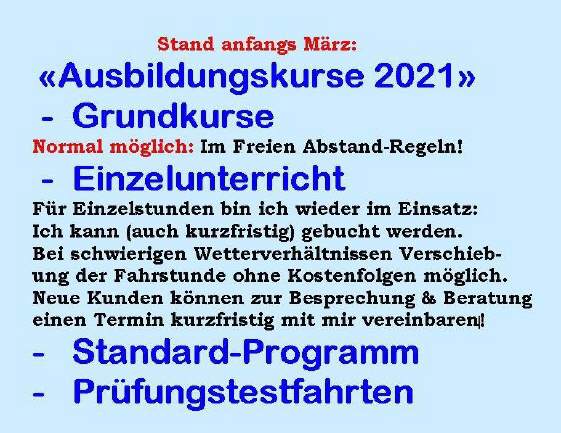 Grundkurse: Wer bei mir die Grundkurse besucht, macht in jedem Fall vorher eine Standortbestimmung! Dort muss ich entscheiden, ob er/sie mit diesem selbst angeeigneten Können das Eintrittsniveau erreicht, das es in meinem Fahrzeigbeherrschungskurs braucht. Der letzte Grundkurs Teil 1 fand am SA, 10.Okt. 2020 statt. Ich habe meine Tätigkeit per Ende 2022 eingestellt. |