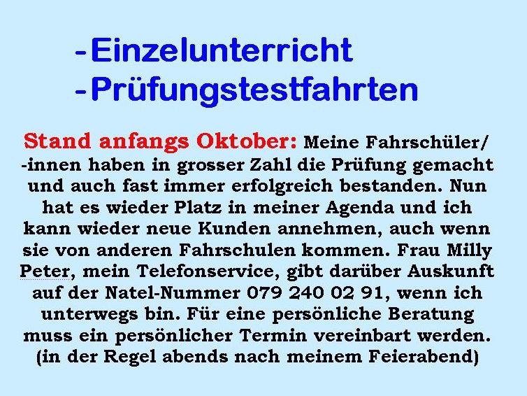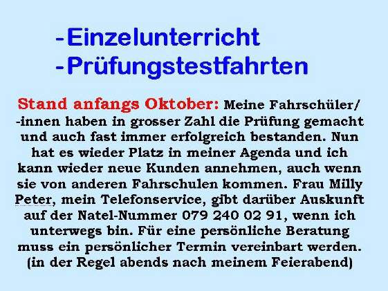Je nach Wetterverhältnissen ist es möglich, ganz spontan - morgens telefonieren, nachmittags abmachen - mit mir Fahrstunden abzumachen. Da ich keine Autofahrschüler habe, geht bei mir auch bei kurzfristiger Verschiebung oder Absage nichts verloren. Ab 2023 nehme ich KEINE NEUEN Fahrschüler/innen mehr!