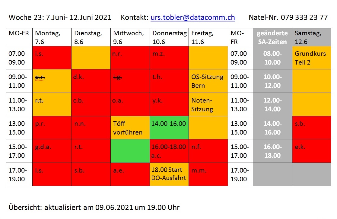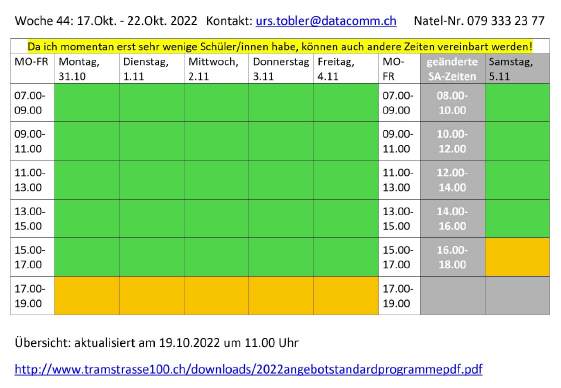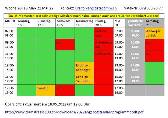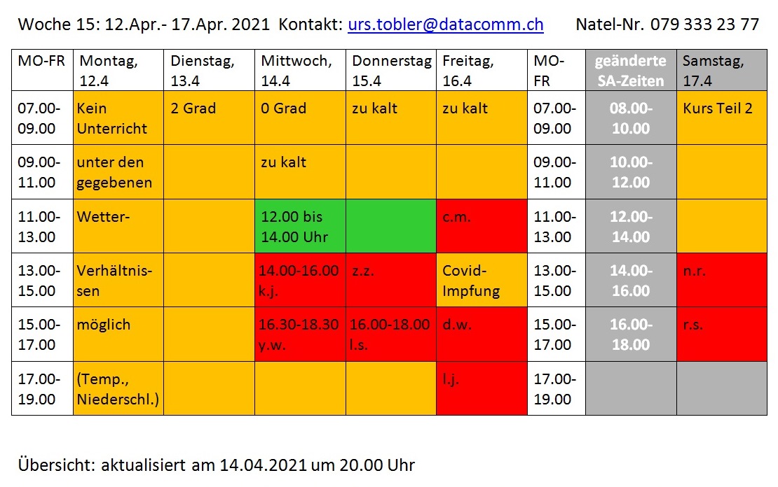 Wenn es die Wetterverhältnisse zulassen bin ich «in Betrieb»: Du kannst also (auch ganz kurzfristig!) mit mir eine Fahrstunde (Doppellektion) oder allenfalls auch einen Termin zur Besprechnung abmachen. Ich bin nicht regelmässig im Geschäft, deshalb brauche ich etwa 2 Stunden Vorlaufzeit, von Thalwil nach Oerlikon zu kommen.