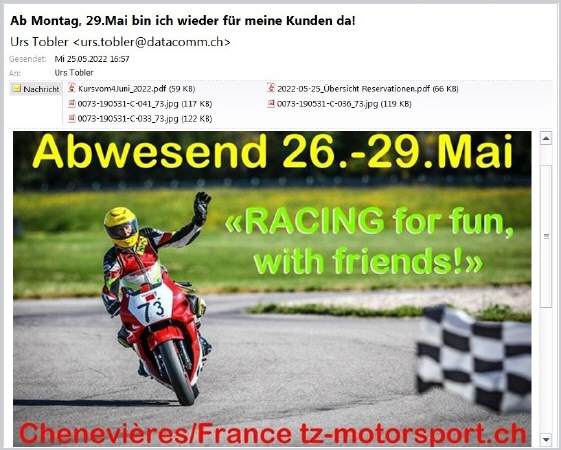 Die Bedingung, eine bestande Kat. A1, A beschr. oder unbeschränkt-Prüfung abgelegt zu haben, ist die Voraussetzung für die KT1-Teilnahme. Wenn Du Leute aus dem Umfeld zu diesem wertvollen und preiswerten Kurs motivieren kannst, mitzumachen, ist die Chance grösser, dass der an Deinem Datum gewünschte Kurs auch tatsächlich durchgeführt werden kann. Ich garantiere Dir, dass Deine Freunde bestimmt nicht enttäuscht, sondern mit grosser Chance begeistert nach Hause fahren! Zu diesem Preis (Fr. 250.-) gibt es kein vergleichbares Angebot im ganzen Land ... Melde Dich sofort per Telefon, oder sende ein SMS an 079 333 23 77, oder sende ein Mail an urs.tobler (at) datacomm.ch |
