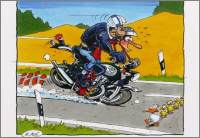 Die Feed-backs am Ende des Kurses waren stets gut bis hervorragend: Für viele, insbesondere diejenigen, die bei mir in der Ausbildung waren und den Kurs als Teil des Obligatoriums besuchten, war es das erste Mal, dass sie einen ganzen Tag auf dem Töff sassen. Entsprechend waren sie geschafft und hundemüde. Aber sie waren auch alle locker unterwegs, was vielleicht gerade in der Tatsache lag, dass sie vor lauter Müdigkeit sich nicht mehr am Lenker festhalten konnten. Besonders krass waren jeweils die Feed-backs* nach einem Regenkurs: Wenn es den ganzen Tag geregnet hatte, verlor man die Angst davor, bei immer grösser werdenden Schräglagen in die Kurven zu fahren und nahm in Kauf, «dass es auch mal etwas rutschte» ... «Locker vom Hocker» ist das Wichtigste beim Töfffahren, der Blick steuert und man muss die Maschine einfach fahren lassen. Je weniger der Lenker bewusst «lenkt», desto schneller wird man die Einheit «Fahrer/Maschine» erleben. Und die Fahrgeschwindigkeit muss dabei immer «im grünen Bereich» liegen, fährt man im (für die Person) orangen oder gar roten Bereich, ist man unfallgefährdet. Der Kurs startet extrem langsam, d.h. alle können auf ihrem Niveau abgeholt werden, und in der Gruppe steigert man sich zunehmend. Das Schräglagentraining hilft die Angst vor Schräglage abbauen. Wer ernsthafte Probleme hat mit der Schräglage, der sollte sich vorher im Einzelunterricht helfen lassen: Schwerwiegende Probleme, wie Kurvenangst, Angst vor Geschwindigkeit, Verkrampfungen, die auf Unfälle oder Stürze zurückzuführen sind, können innerhalb einer Gruppe nicht behoben werden. Wer noch nie in seinem Leben während der Ausbildung oder innerhalb von Weiterbildungskursen ein Schräglagentraining absolviert hat, tut gut daran, sich ebenfalls vor dem KT1-Kurs um einen individuellen Termin zu kümmern. Dann kann der Weiterbildungskurs im Kurvenfahren unter viel besseren Voraussetzungen stattfinden und es ist mit deutlich mehr Fortschritt zu rechnen. Solche Vorbereitungslektionen können auch samstags absolviert werden. |