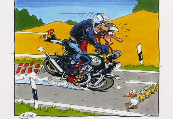 Das Label von Holger Aue heisst «motomania»: Anlässlich der «SWISS-MOTO» verkaufte ich regelmässig seinen Jahreskalender, seine Bücher, seine Tassen und T-Shirts. Es sind noch welche Artikel, auch T-Shirts in geringer Anzahl vorhanden.