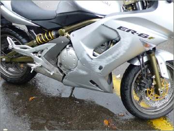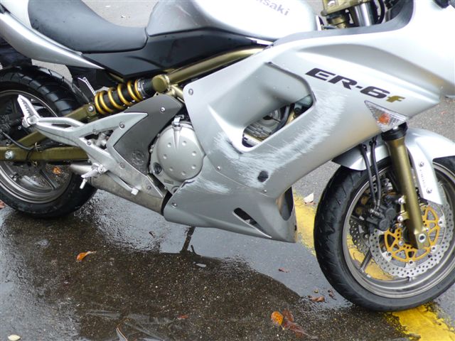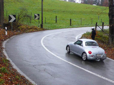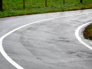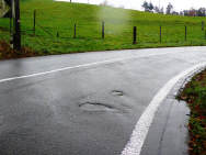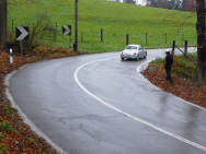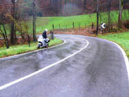 Auf der oberen Bilderfolge kann abgelesen werden, wo etwa die Fahrspur «hätte liegen müssen»: Da wo das linke Hinterrad seine Spur fährt! So lernt man es in der Fahrschule, im Kurventechnik-Kurs. In Tat und Wahrheit fuhr der Fahrschüler die Kurve rechts an, mit relativ guter Schräglage (für die Wetter- und Strassenverhältnisse) und nach den Löchern in der Strasse, verlor das Vorderrad die Haftung und die Maschine mitsamt Schüler und Fahrlehrer schlitterte in Richtung der Mittellinie, wo sie zum Stehen kam... |
