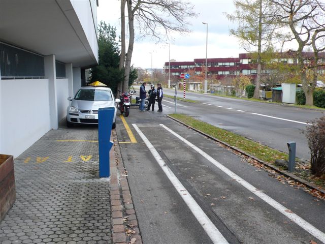 15.Nov. 2007, knapp nach 9 Uhr: SMS an Bianca! Erkundige Dich mal beim Str.V'Amt, ob die A1-Prüfungen heute abge- nommen werden oder nicht. Antwort: Bis jetzt ja, aber fragen Sie nochmals um 11 Uhr! 15.Nov. 2007, 11.00 Uhr: Bianca sichert zu, dass sie die Prüfung abnehmen - aber man MUSS nicht! (kann also zuhause bleiben ohne Kostenfolgen) Da die Strassenverhältnisse inzwischen gut sind, starten wir, nach einem Telefon mit Lorena, der 2.Prüfungskandidatin, in Richtung Strassen- verkehrsamt Albisgüetli. 15.Nov. 2007, 12.00 Uhr: Wir treffen auf der Bremsstrecke Lorena, die bereits fleissig am üben ist. Ich lasse mir je zwei Notbremsungen vorzeigen, dann folgt eine Spurgasse und der enge Slalom und ab geht's nun mit Lorena, nochmals eine kleine Aufwärmrunde in Richtung Stadt, Albisriederplatz, Albisrieden, Triemli und wieder zurück. 15.Nov. 2007, 12.50 Uhr: Wir warten an der Wärme auf den Termin! Beide absolvieren ihre Prüfung auf demselben Feld, mit demselben Prüfungexperten. |