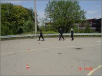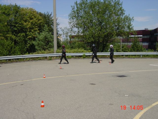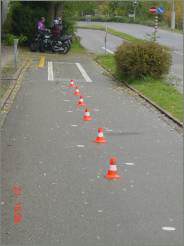 An einer Führerprüfung werden in der Regel 2 Prüfungskandi-daten zur selben Zeit, zum selben Prüfungsexperten auf dem-selben Feld vorgeladen. Da sich der Prüfer hinten drauf setzen muss, will er zuerst die Manöver sehen, damit er sich mit gutem Gewissen jemandem anvertrauen kann, in den Verkehr hinaus-zufahren. Die Manöver umfassen das Langsamfahren in der Spurgasse (1 Meter breit, 10 Meter lang, mind. 15 Sekunden), einer Kurvenübung wie Achterfahren, Slalom geradeaus oder versetzt sowie einer Vollbremsung aus 50 km/h. Das Bergan-fahren kann sowohl auf dem Areal oder im Verkehr geprüft werden. Nur wer die Manöver erfüllt, kann die Fahrt im Verkehr angehen - andernfalls wird die Prüfung (mit Kostenfolge!) abgebrochen. |