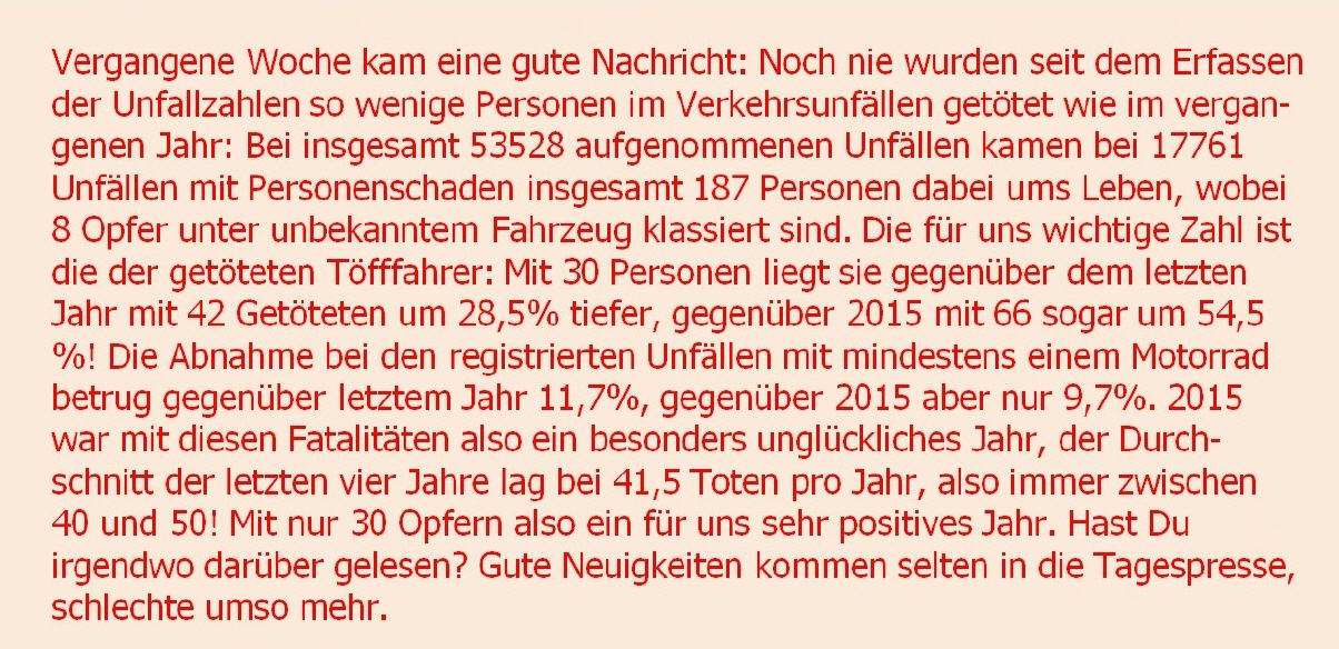 Vergangene Woche kam eine gute Nachricht: Noch nie wurden seit dem Erfassen der Unfallzahlen so wenige Personen im Verkehrsunfällen getötet wie im vergangenen Jahr: Bei insgesamt 53528 aufgenommenen Unfällen kamen bei 17761 Unfällen mit Personenschaden insgesamt 187 Personen dabei ums Leben, wobei 8 Opfer unter unbekanntem Fahrzeug klassiert sind. Die für uns wichtige Zahl ist die der getöteten Töfffahrer: Mit 30 Personen liegt sie gegenüber dem letzten Jahr mit 42 Getöteten um 28,5% tiefer, gegenüber 2015 mit 66 sogar um 54,5 %! Die Abnahme bei den registrierten Unfällen mit mindestens einem Motorrad betrug gegenüber letztem Jahr 11,7%, gegenüber 2015 aber nur 9,7%. 2015 war mit diesen Fatalitäten also ein besonders unglückliches Jahr, der Durchschnitt der letzten vier Jahre lag bei 41,5 Toten pro Jahr, also immer zwischen 40 und 50! Mit nur 30 Opfern also ein für uns sehr positives Jahr. Hast Du irgendwo darüber gelesen? Gute Neuigkeiten kommen selten in die Tagespresse, schlechte umso mehr.