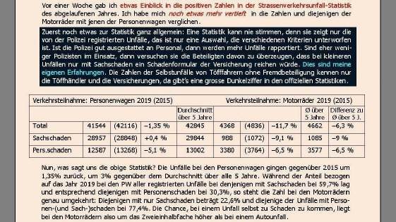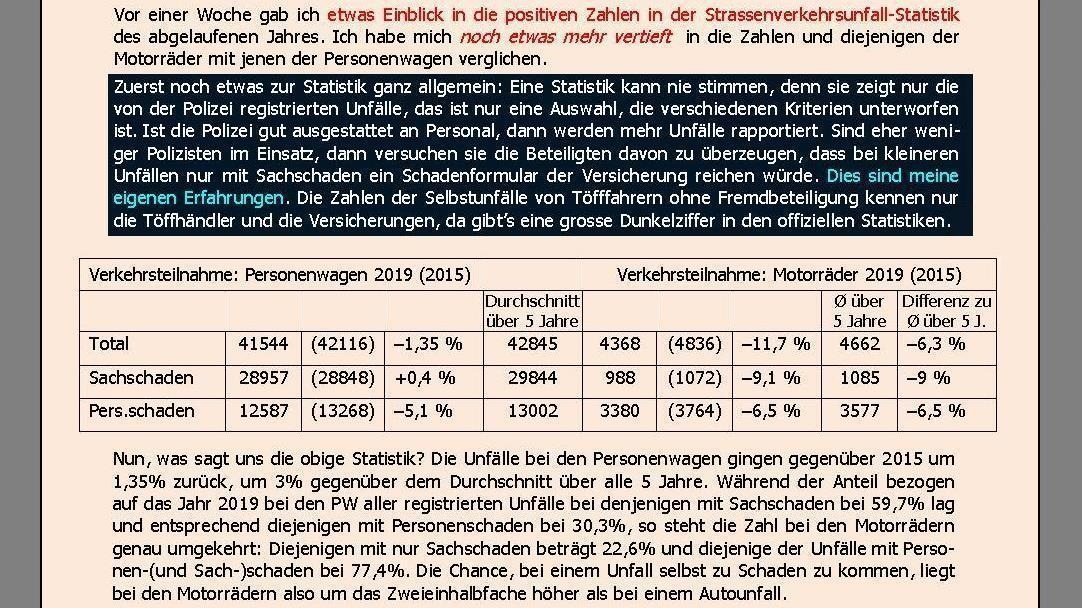 Nun, was sagt uns die obige Statistik? Die Unfälle bei den Personenwagen gingen gegenüber 2015 um 1,35% zurück, um 3% gegenüber dem Durchschnitt über alle 5 Jahre. Während der Anteil bezogen auf das Jahr 2019 bei den PW aller registrierten Unfälle bei denjenigen mit Sachschaden bei 59,7% lag und entsprechend diejenigen mit Personenschaden bei 30,3%, so steht die Zahl bei den Motorrädern genau umgekehrt: Diejenigen mit nur Sachschaden beträgt 22,6% und diejenige der Unfälle mit Personen-(und Sach-)schaden bei 77,4%. Die Chance, bei einem Unfall selbst zu Schaden zu kommen, liegt bei den Motorrädern also um das Zweieinhalbfache höher als bei einem Autounfall. |