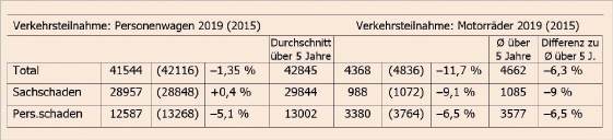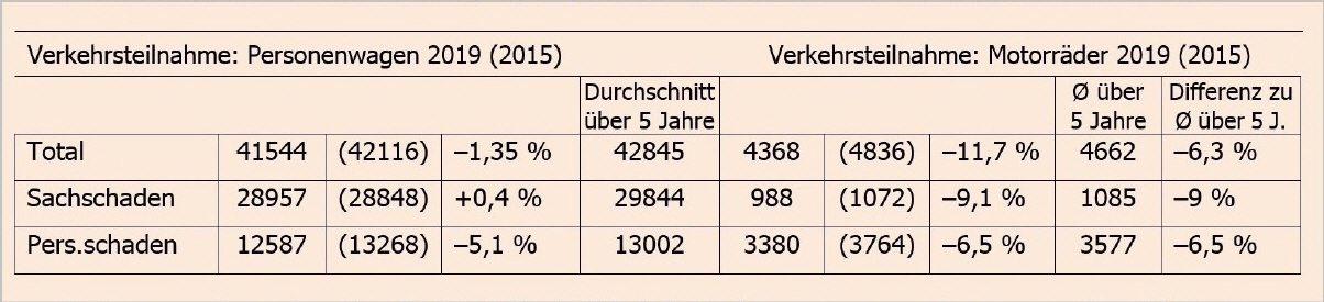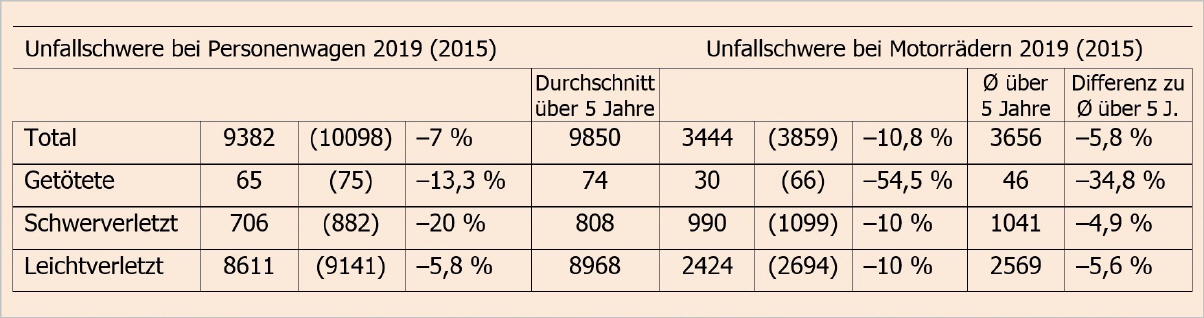 Die Zahlen bei den Motorrädern widerspiegeln die Verletzlichkeit der Motorradfahrer: Bei 4368 Unfällen im Jahr 2019 kamen 3380 Leute zu Schaden, davon 1860 Töfflenker als Hauptunfallverursacher (Sach- und Personenschaden), das heisst ein Anteil von 77,4%! Bei den Autounfällen betrug dieser Anteil nur 30,3%. Neben den 30 Getöteten (8,7 Promille der in einen Unfall verwickelten Motorradfahrenden) erlitten 990 schwere Verletzungen und 2424 leichte Verletzungen. Der Anteil bei insgesamt 3444 Personen in total 3380 Motorradunfällen betrifft 28,75% Schwerverletze, sowie 70,4% mit leichten Verletzungen. Also sind auch 64 Mitfahrende betroffen. Der Rückgang gegenüber dem Vorjahr 2018 betrug 28,5% (45,3%) bei den tödlich endenden Unfällen, 7,3% (4,9%) bei den Schwerverletzten sowie 5% (5,4%) bei den Leichtverletzten. Die Zahlen in Klammern bezeichnen den Rückgang im Schnitt über alle 5 Jahre gemessen. Die Zahlen widerspiegeln eine gesamteuropäische Tendenz.