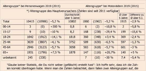 "Glaube keiner Statistik, die Du nicht selber (gefälscht) erstellt hast": Ich hoffe sehr, dass ich die Zahlen korrekt übertragen habe. Wenn man die Zahlen betrachtet, dann fallen zwei Altersgruppen auf, die entgegen dem allgemeinen Trend schlechter entwickelt haben. Die Unfallzahlen für die 18-24jährigen liegen aber immer noch unter dem Mittel der letzten 5 Jahre, während die Zahl bei den Senioren 65+ leicht, 5% über dem Mittel liegen. Ich vermute, dass sie im Vorjahr 2018 wegen der grossen Hitze deutlich weniger unterwegs waren und deshalb deutlich unter dem Mittelwert (2018: 116 von 140 Verunfallten im 5 J.-Durchschnitt). Es irritiert mich, dass in 252 (348) Fällen das Alter der verunfallten Personen unbekannt ist, und das in der sonst so genauen Schweiz! Immerhin handelt es sich um leicht- oder schwerverletzte Personen, die durch einen Arzt und ein Spital betreut wurden. Ich nehme nicht an, dass ein Polizist auf der Unfallstelle entscheidet, ob jemand leicht oder schwer verletzt ist. |