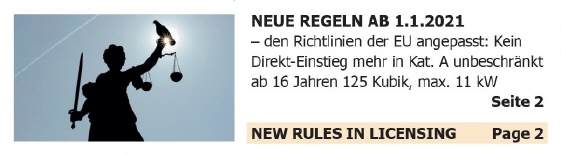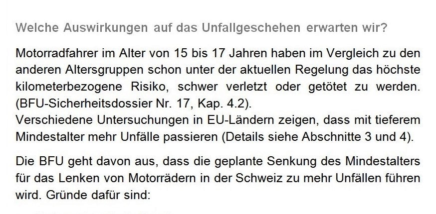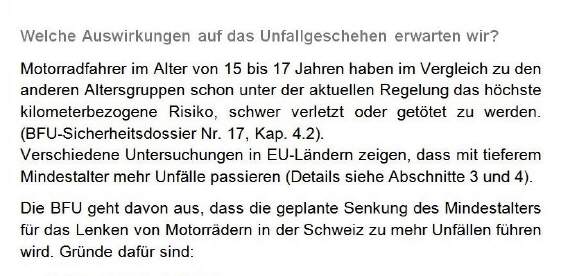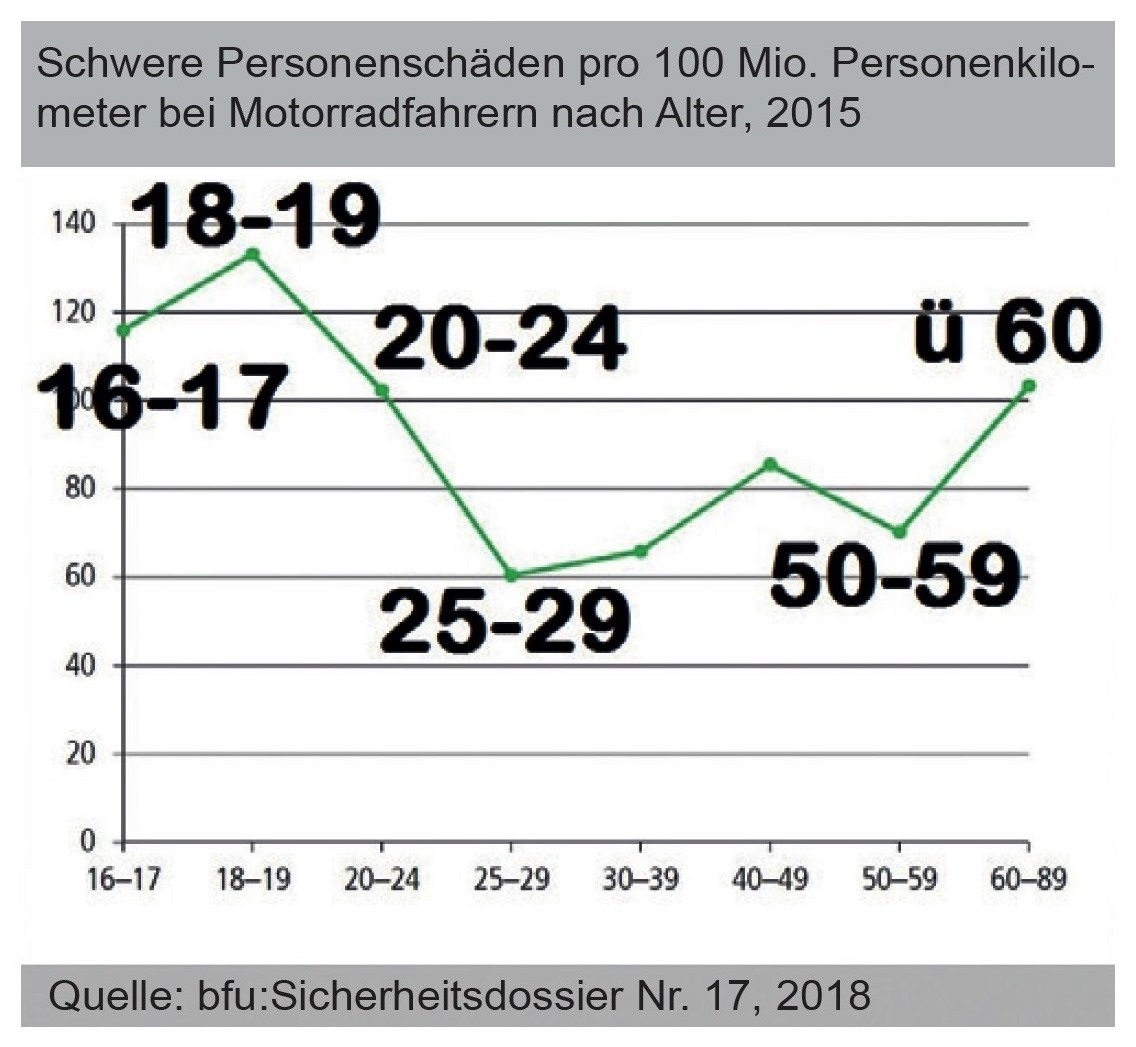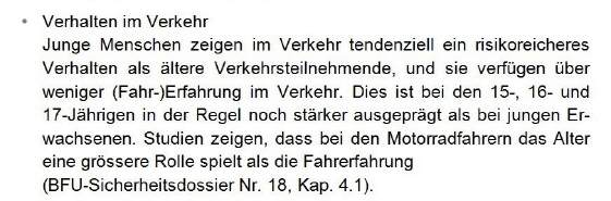 Das Eintrittsalter für Maschinen grösser als 125 Kubik bleibt weiterhin bei 18 Jahren. Einen Direkteinstieg für über 25jährige Einsteiger gibt es nach dem 31.Dez. 2020 also nicht mehr. Ob die Möglichkeit, als 16jährige bereits 125er zu fahren, zu einer grösseren Unfallhäufigkeit bei den jungen Fahranfängern kommt, weiss niemand – aufgrund der Erfahrungen in anderen europäischen Ländern muss es mindestens befürchtet werden. |