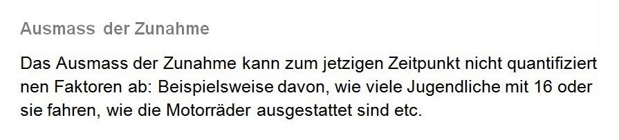 Lies dazu diese GANZE Seite: Ich habe die Auswirkungen der in Österreich im Jahr 2013 eingeführte Regelung betr. 16-jährige 125er-Fahrende studiert und mache mir ernsthafte Sorgen, dass die neue Regelung viel Leid in viele Famnilien bringen wird, u.a. auch deshalb, weil viele FahrlehrerInnen, die Töff-Unterricht anbieten, ihre damit verbundene Verantwortung nicht wahrnehmen: Sie sehen diese jungen Kunden nur unter dem Aspekt, sie in Zukunft in der Autofahrschule als Kunden zu haben. Eine Töff-Ausbildung, die die 16-Jährigen dringend benötigen, wird nicht vermittelt. "Wenn Du dann die Autoprüfung hast, wird Dir diese A1-Prüfung geschenkt!" - mit 125er-Maschinen ist die Ausbildung noch viel wichtiger als mit 50 Kubik-Maschinen, weil sie damit wohl noch viel mehr, damit selbst auf der Autobahn unterwegs sind!