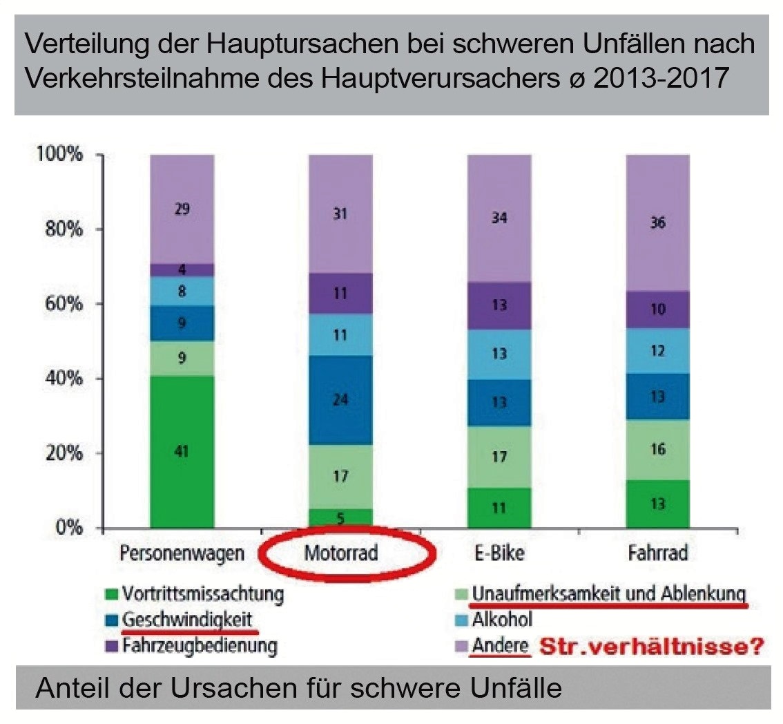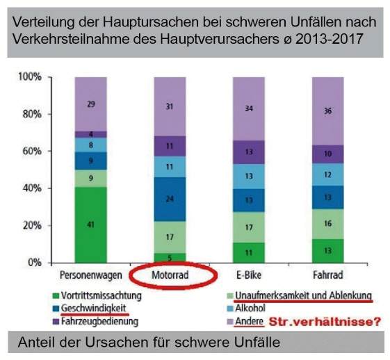 Neben Geschwindigkeit und Ablenkung sind es bei den Motorradfahrern vor allem ANDERE Gründe als Unfallursachen. Da dürften bestimmt die Strassenverhältnisse einen grösseren Faktor spielen als bei den übrigen Verkehrsteilnehmern. |
