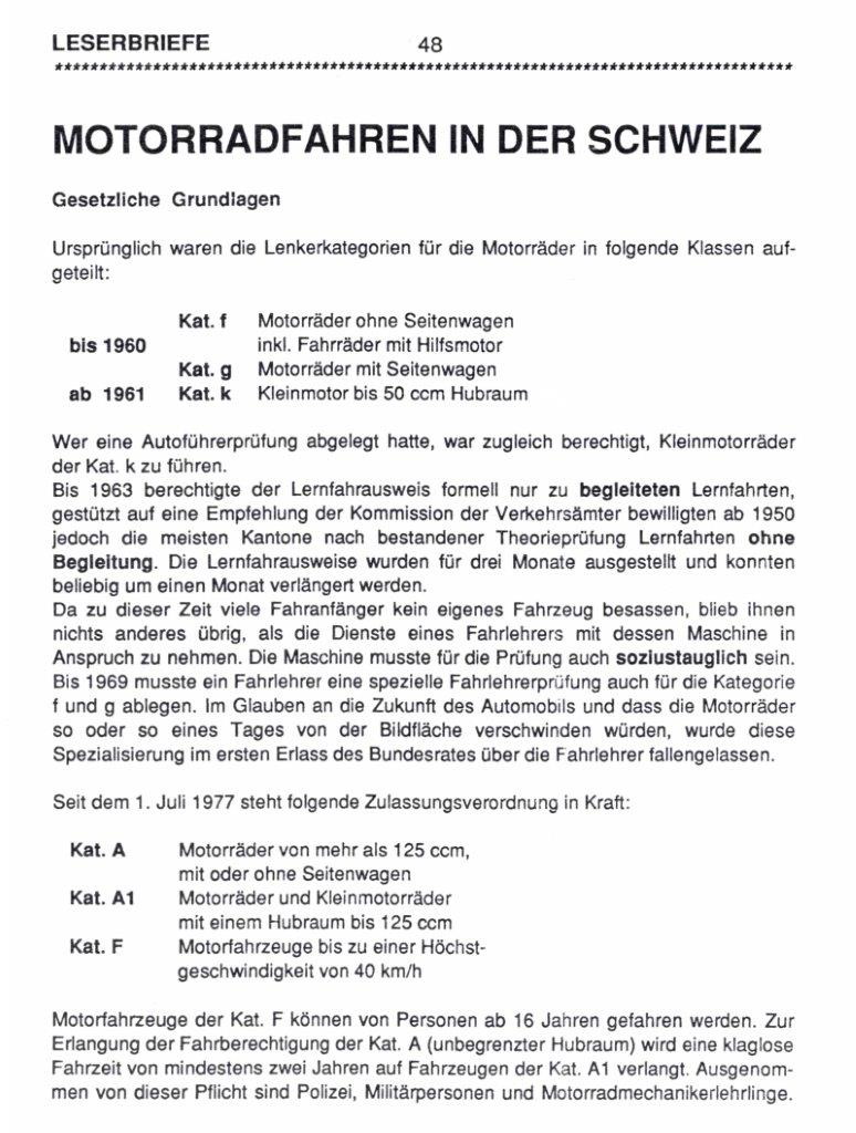 Spannend, wie über die Töfffahrenden zu dieser Zeit geschrieben wurde: Bei im Vergleich beachtlichen Unfallzahlen im Jahr 1987 von 146 Getöteten (2022: 46) und rund 4500 Schwerverletzten (2022: 1036) wurden die Töfffahrer (zu 90% männlich) als rücksichtslos, gemeingefährlich Strassenrowdys und Rocker bezeichnet. Um den Text leserlicher zu machen, habe ich ihn extra gescannt und in einem separaten PDF abgespeichert.