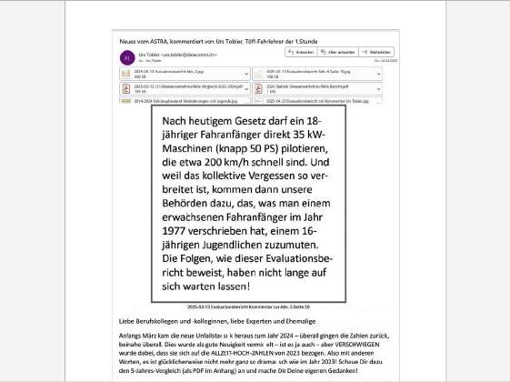 Basierend auf dem Original des Evaluations-Berichts (28 Seiten) vom 13.03.2025 mit Kommentar zu der neuen Kategorie A1 125 Kubik für 15- bis 17-Jährige als PDF [2'740 KB]