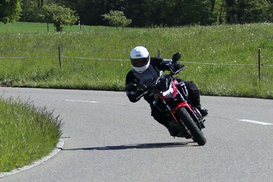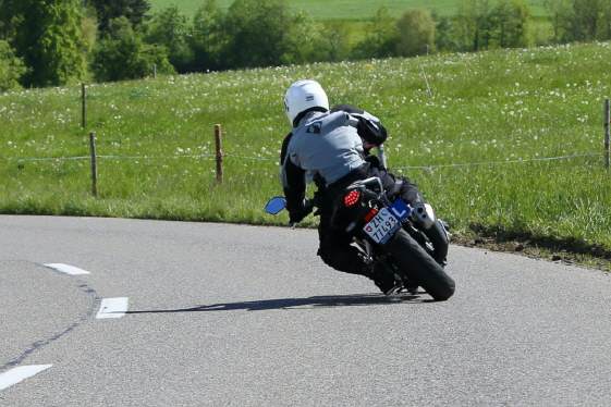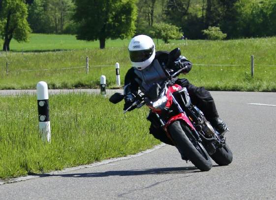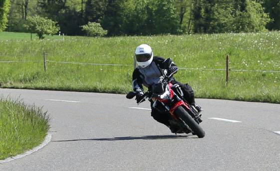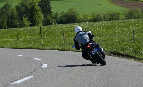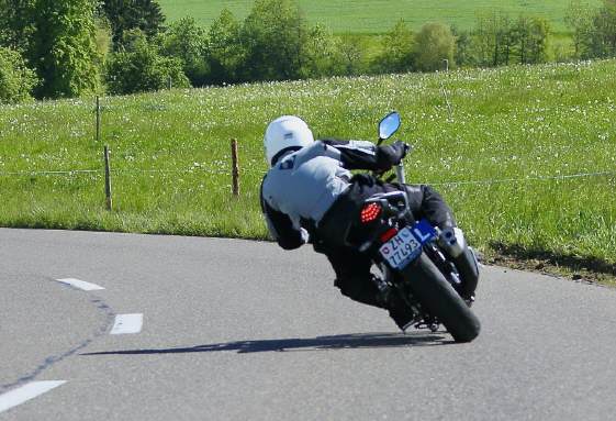 Kurvenfahr-Stil: «hängen» (Oberkörper/Gesäss leicht auf Kurven-Innenseite), in Englisch: «hanging-off» (etwas für Rennfahrende ...)