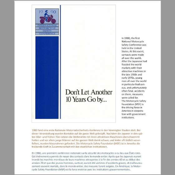 Nach 1980 trafen sich weltweit zum 2.Mal Politiker und Fachleute aus Industrie, Unfall- und Verhaltensforschung, Verkehrs- und Erziehungsministerien sowie Motorrad-Instruktoren in Amerika zur Standortbestimmung und Rückschau, wohin uns die vergangenen Jahrzehnte in der "Sicherheit für Motorradfahrer" gebracht haben, Zusammen mit der Folgekonferenz im Oktober 1991 im deutschen Bochum sollte der Weg in die Zukunft definiert werden. Zusammen mit meiner Frau Luzia nach ich in Orlando mit einem vielbeachteten eigenen Beitrag teil, der über die schweizerische Regelung von Motorrad-Führerausweis, dem Stand der Ausbildungs - und Prüfungssituation sowie dem einzigartigen Experiment der Fahrschule nur für Motorradfahrer die Situation aus meiner Sicht beleuchtet.