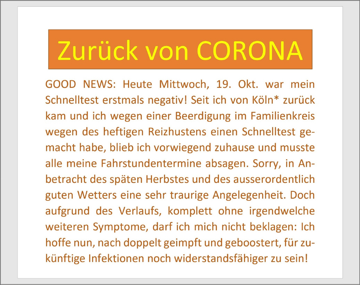 Die Schlussfahrt ging gut über die Runde! Ich hielt Distanz, trug Maske im näheren Kontakt, sei es im Auto oder anlässlich der Materialübergabe. Und da ich überhaupt keine Symptome hatte, der Reizhusten nach und nach abklang, erwartete ich eigentlich das baldige Ende der Infektion. Eine Woche später, wieder im Vorfeld einer Beerdigung, diesmal im Freundeskreis, ging ich zu einem weiteren Schnelltest. Leider war dieser 8 Tage danach wieder positiv. So musste ich alle meine Fahrstundentermine am Samstag absagen. In der darauf folgenden Woche war ein wqeiterer Termin abgesabgt: Am Donnerstag hatte ich die Prüfungsleitung bei Motorrad-Fahrlehrer-Berufsprüfungen (Zusatz-Qualifikation Motorrad-Fahrlehrer), wo ich sicher gehen wollte, nicht mehr ansteckend zu sein. Zu meiner grossen Entlastung war der zweite Schnelltest, diesmal am 13.Tag nach Entdeckung der Infektion, negativ: Good News